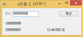 완성한 프로그램에 x 값을 주면 실제 연산 결과와 함께 연산에 걸린 총 시간을 표시한다. 소스 중에 Thread.Sleep(5000); 부분이 있는데 UI 에서 5초정도 걸리는 대형 작업이 진행되는 구간이라 간주한다. UI 에서 5초의 시간이 걸리니 총 결과 시간은 5초+ α 정도 걸리게된다.
