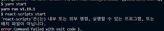 " react-scripts'은(는) 내부 또는 외부 명령, 실행할 수 있는 프로그램, 또는배치 파일이 아닙니다. " 라는 에러메세지를 볼수 있다
