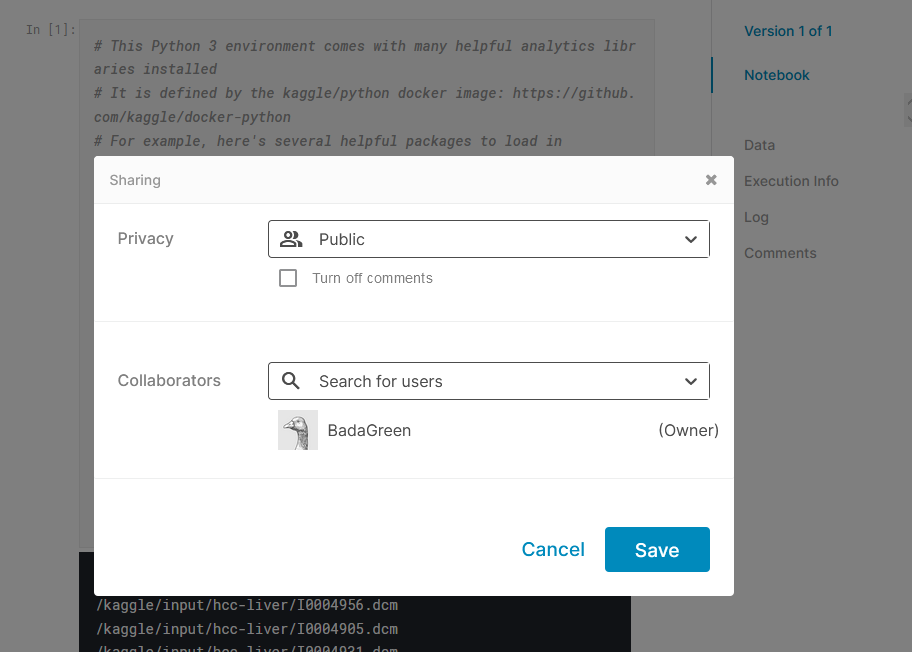 - Notebook에 소스코드 및 Descrption을 작성한후 제출할 경우 기본으로 Private 설정으로 되어 있음