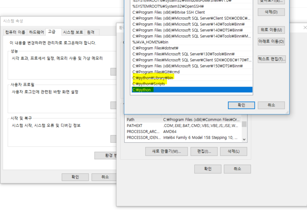 추가적으로 anaconda를 설치하면 환경변수를 해야한다. 환경변수 디렉토리의 Library\bin, Scripts , 해당 디렉토리를 각각 추가해준다.